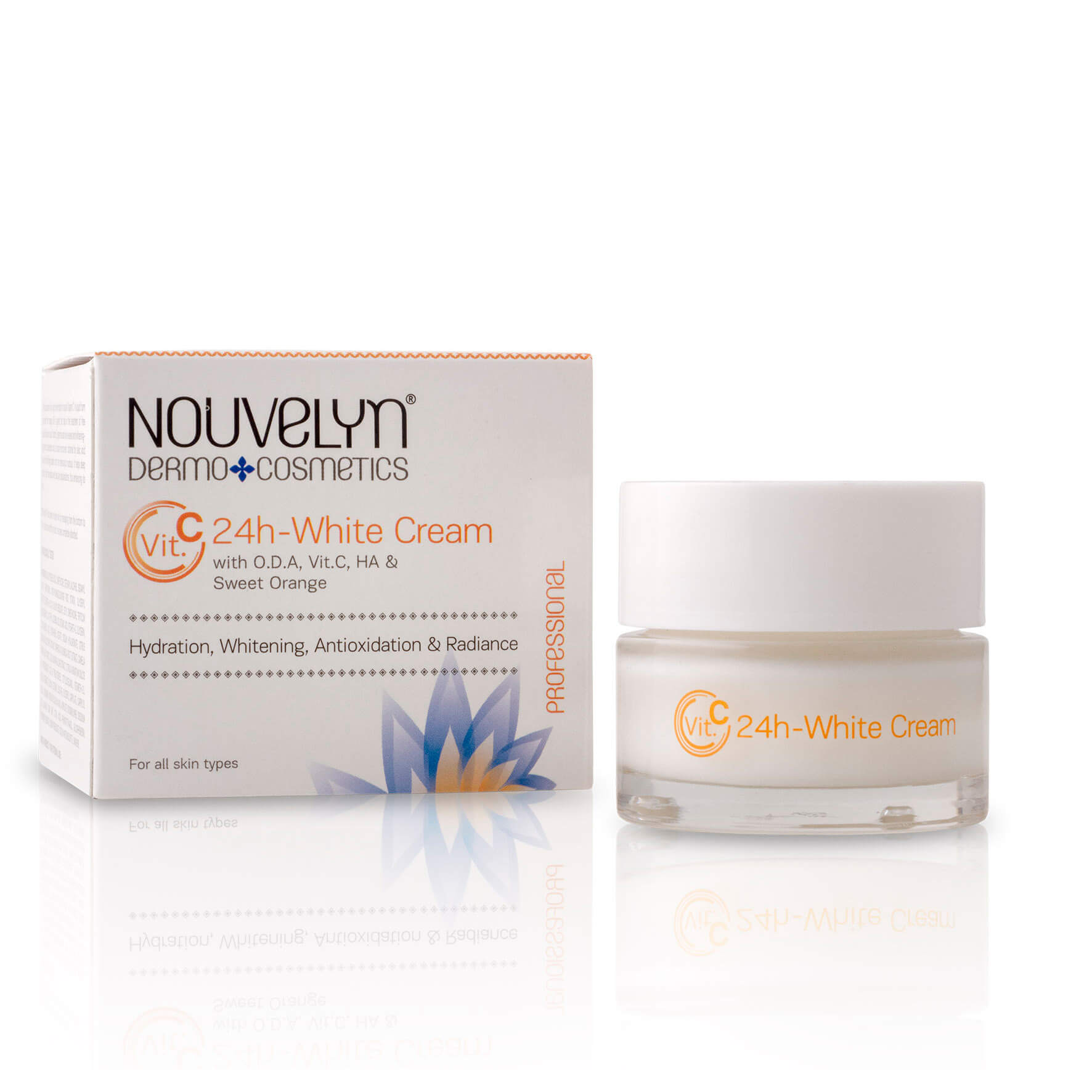 Η 24H WHITE CREAM-VIT.C είναι μια 24ωρη κρέμα προσώπου με υψηλή συγκέντρωση φυσικής Βιταμίνης C . Επιπλέον, είναι πλούσια σε παράγοντες που ενυδατώνουν ενώ παράλληλα βοηθούν στην αντιμετώπιση των ελεύθερων ριζών, Υαλουρονικό οξύ, βιταμίνη Ε, εκχύλισμα πορτοκαλιού-πράσινου τσαγιού, φύλλων ελιάς και λευκαντικούς παράγοντες (octadecenedioic acid, φυσικό συστατικό που λαμβάνεται με βιοζύμωση από oleic acid και αναστέλλει τη μελανίνης από τον πυρήνα του μελανοκυττάρου). Βοηθάει στη βαθιά ενυδάτωση, την καταπολέμηση των ελεύθερων ριζών και στην αντιμετώπιση των δυσχρωμιών του δέρματος, ενισχύοντας την λάμψη του.