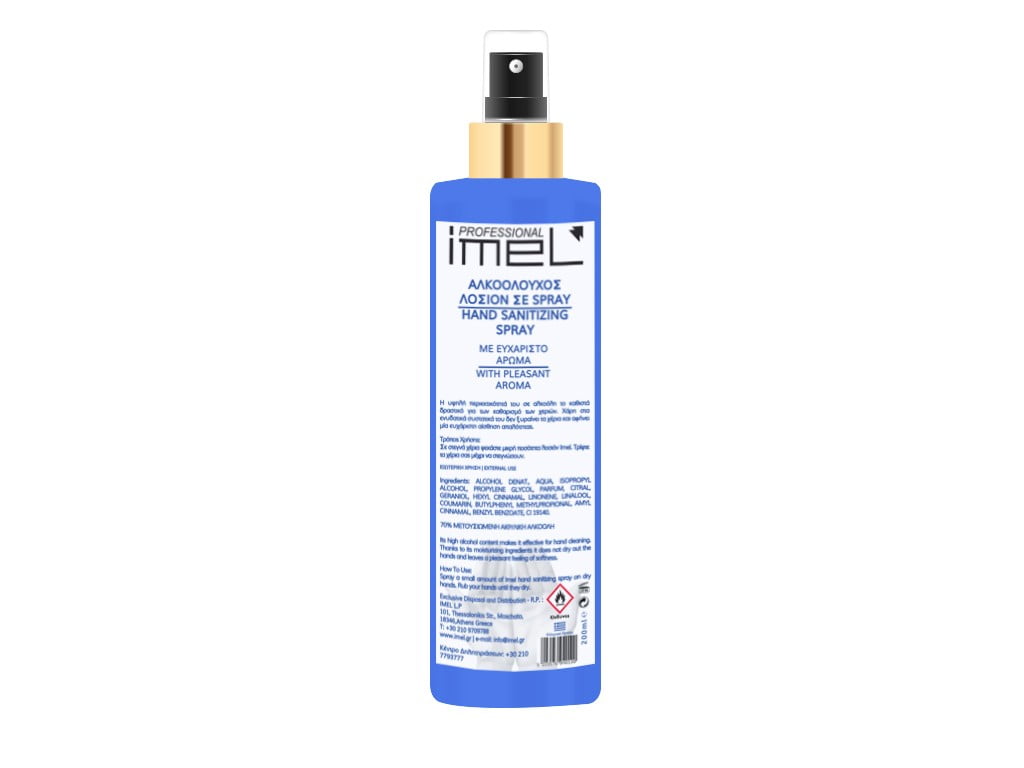 Η Imel Hand Sanitizing Spray είναι ένα αλκοολούχο διάλυμα σε μορφή spray. Η υψηλή περιεκτικότητά του σε αλκοόλη το καθιστά δραστικό για των καθαρισμό των χεριών. Χάρη στα ενυδατικά συστατικά του δεν ξεραίνει τα χέρια και αφήνει μία ευχάριστη αίσθηση απαλότητας. Σύμμαχος για την καθημερινή περιποίηση και προστασία του δέρματος των χεριών.