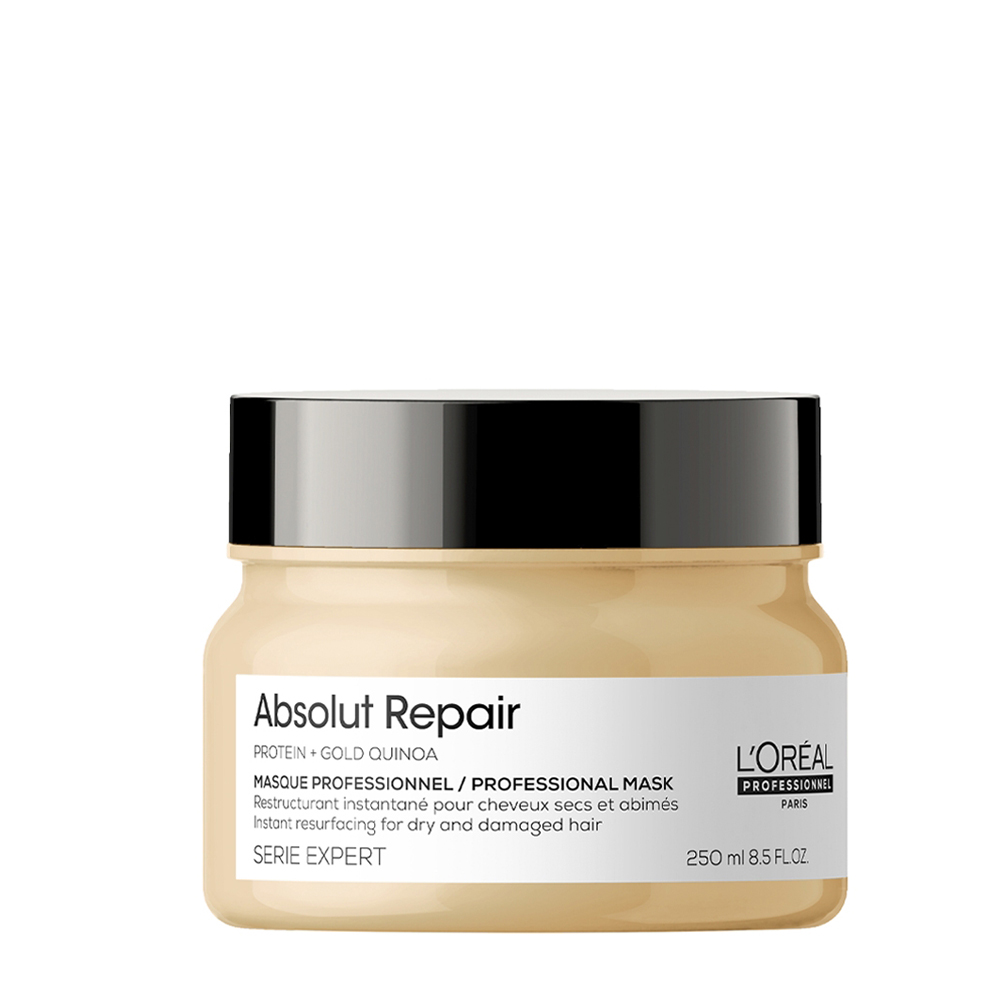 Το L’Oréal Professionnel Absolut Repair Golden Masque 250ml αναδομεί την τρίχα σε βάθος και ξαναδίνει δύναμη και αντοχή στα πολύ ταλαιπωρημένα μαλλιά με την πρωτοποριακή τεχνολογία που αποτελεί μία τεχνολογική επανάσταση, εμπνευσμένη από την περιποίηση της επιδερμίδας. Ένας μοναδικός συνδυασμός συστατικών από GOLD QUINOA + PROTEIN και η χρυσή φόρμουλα της Absolut Deep Repair Gold Quinoa Masque, στοχεύει στις πολύ ευαισθητοποιημένες περιοχές της τρίχας, ενδυναμώνοντας και ενισχύοντας τη δομή της, ενώ παράλληλα επανορθώνει τον πυρήνα και προστατεύει από εξωτερικές επιθέσεις.